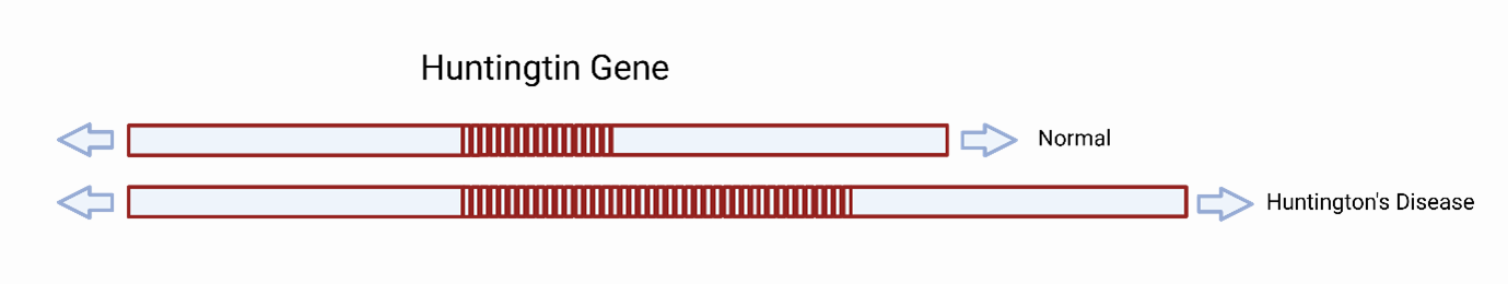 There is a small repetitive sequence in the Huntingtin gene. The number of repeats varies between people. When this repetitive sequence has too many extra copies it causes Huntington’s Disease (HD). Most people have 10 – 35 of these repeats. When there are 40 or more it causes HD and is considered to be a mutation. Those who have 36 – 39 copies might go on to develop HD, but if they do, they usually get the disorder at an older age.